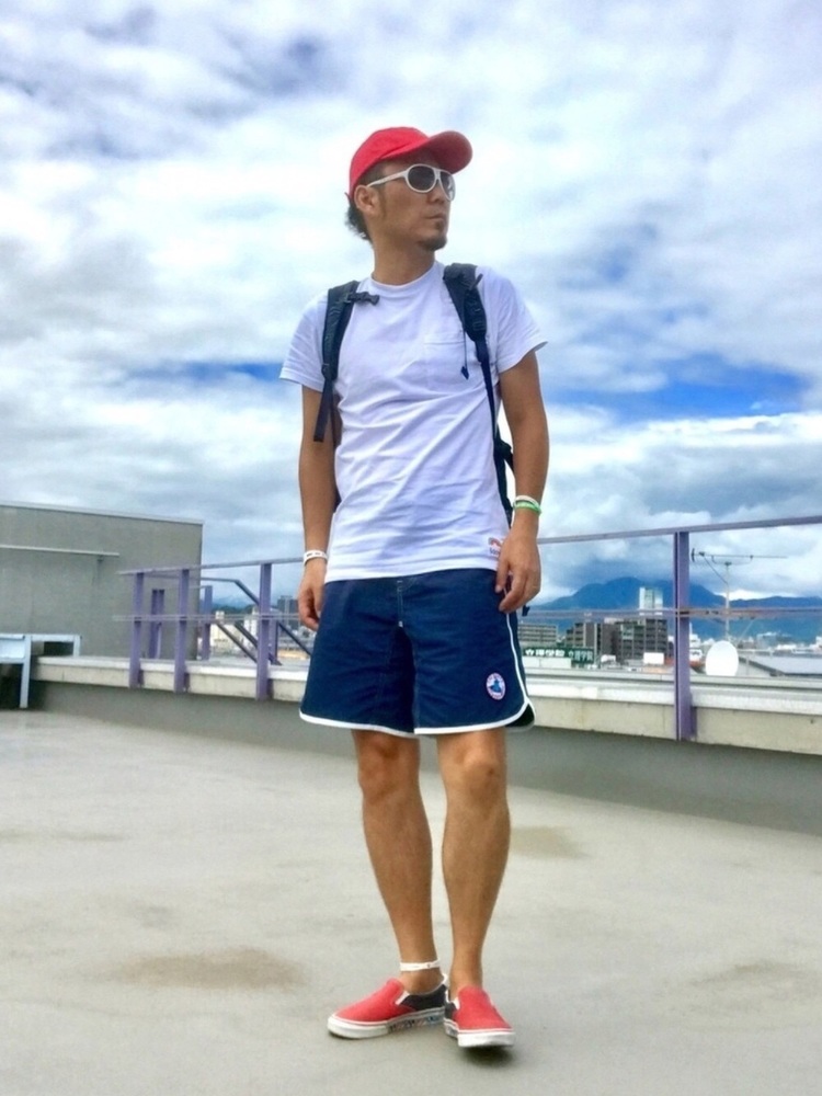 リュックとボードショーツを合わせたアウトドアに最適なスタイルです。コーデのカラーも夏感のある赤、白、青で統一しているのでコーデに統一感がありますね。ビーチ用にはもちろん、街履きにも使用できるシンプルコーデ。ボードショーツはリュックとの相性が抜群なので合わせるのがオススメです。
