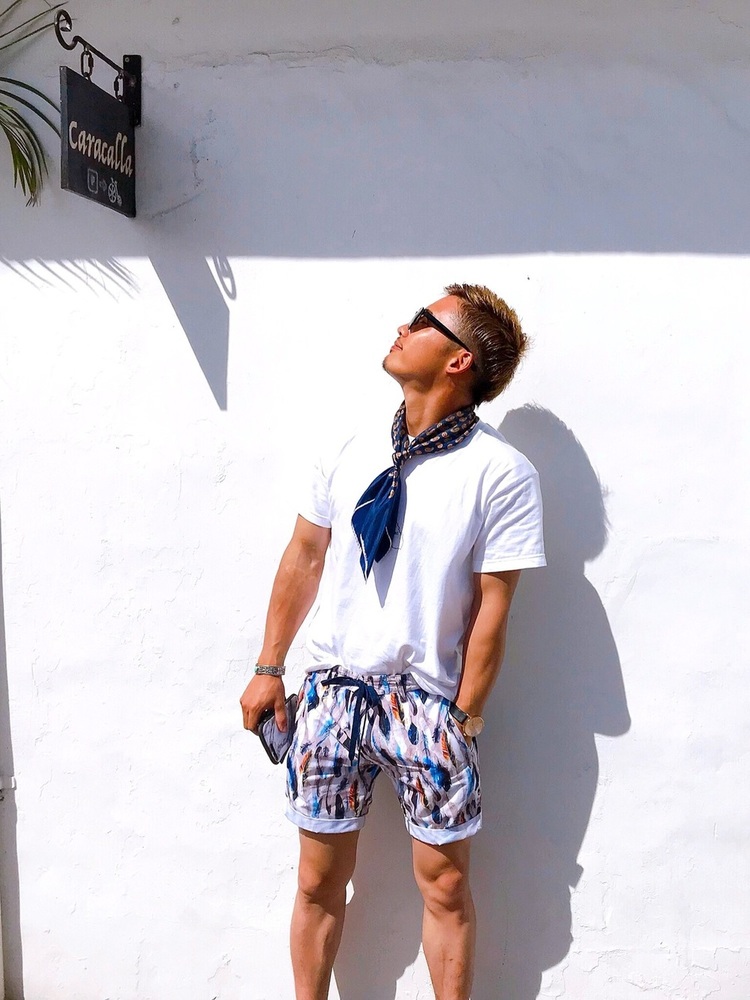 こちらはTシャツにスカーフを合わせ、ボードショーツと着こなしたスタイル。スカーフは夏のコーデにフィットし、シンプルなトップスによく合います。ボードショーツも柄があるのでシンプルなトップスでスマートに着こなすことができていますね。少しオシャレのアクセントを入れたいときにオススメのスカーフ。