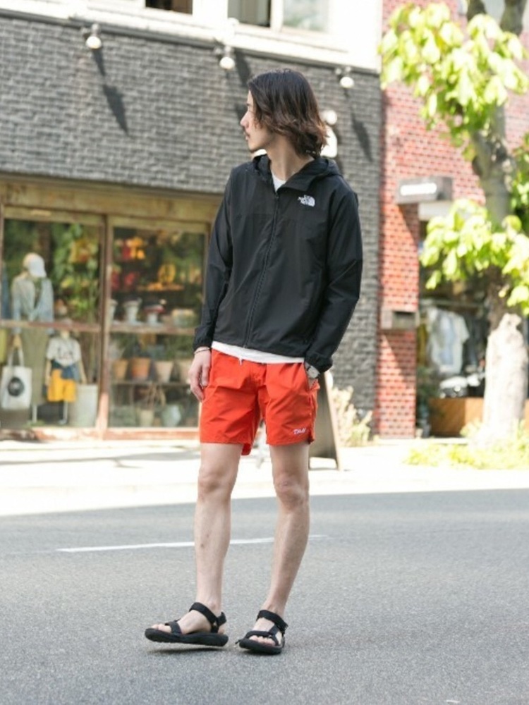 こちらはマウンテンパーカーとボードショーツを合わせたコーデ。夏のアウトドアやフェスなどに最適なスタイルです。シンプルなマウンテンパーカーはどんなボードショーツに合うので1枚持っていると便利ですね。派手な色柄のボードショーツによく合うのでオススメです。