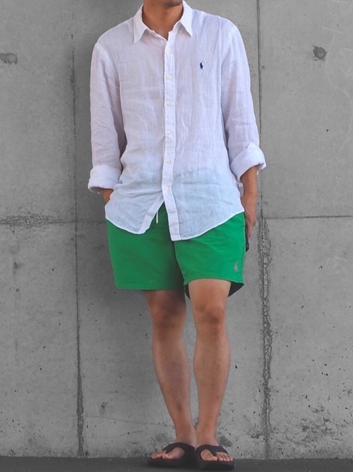 夏らしく白のリネンシャツとナイロンショーツのコーデです。ナイロンショーツをカジュアルに見せすぎない大人の着こなしですね。夏はコーデが軽く、シンプルになりがちですが、このように色を取り入れることでお洒落感が出てきます。シャツの袖口をまくっているのもポイントです。