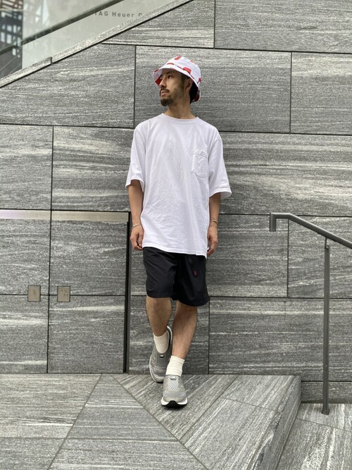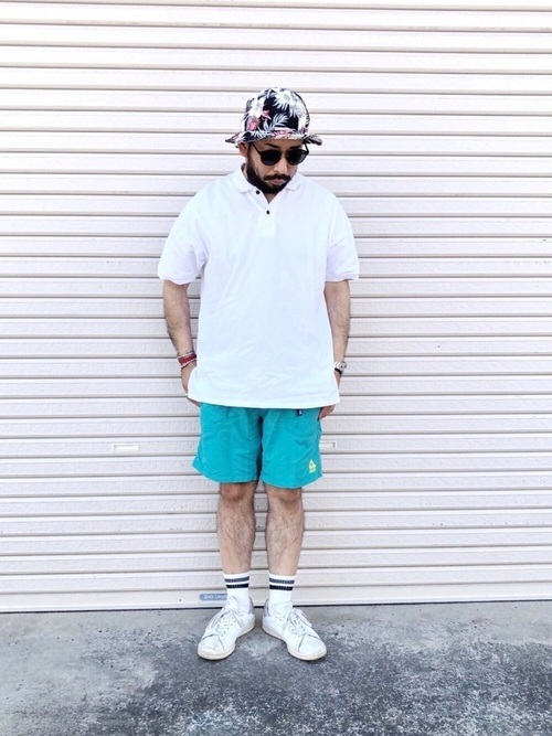 カラフルな柄のバケットハットとナイロンショーツを組み合わせたカジュアルコーデです。ナイロンショーツにソックス&スニーカーをチョイスしたスポーティーな着こなしですね。アクセサリー使いやポイントで取り入れた黒が上手くコーディネートを際立たせています。