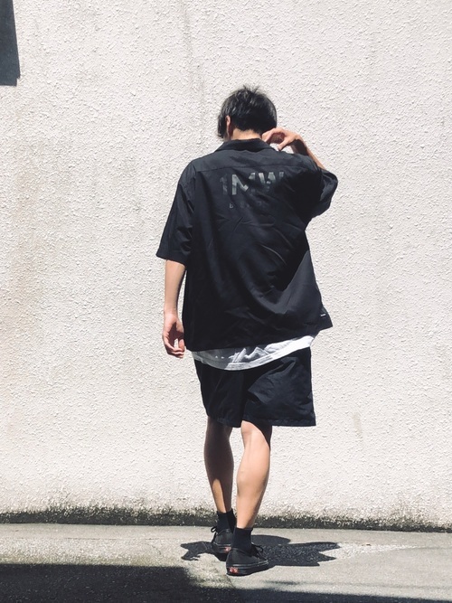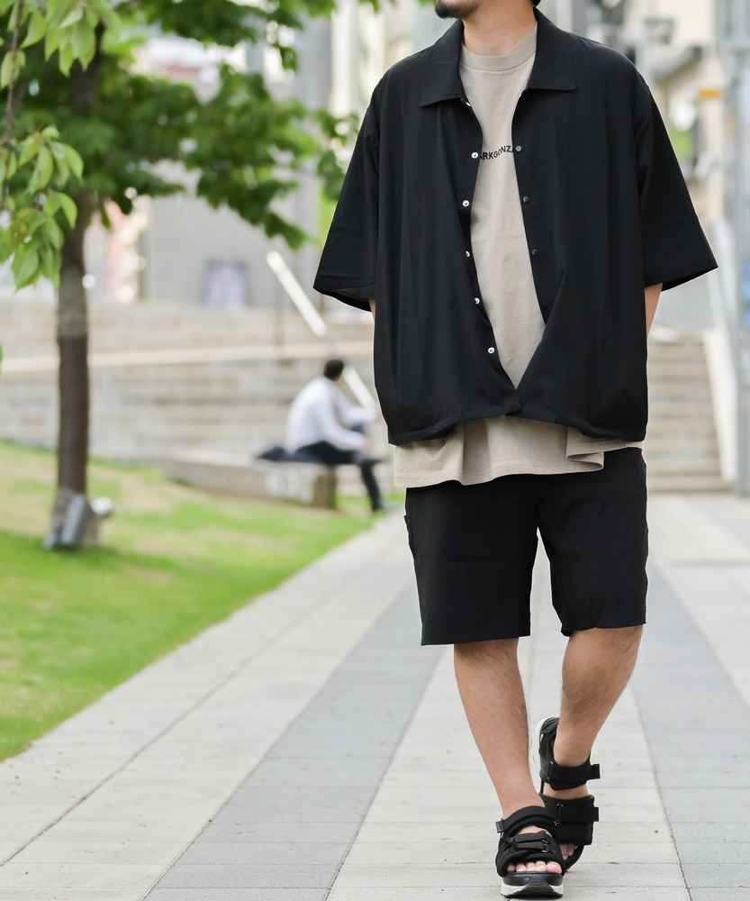 モノトーンでまとめたナイロンショーツのセットアップコーデです。セットアップで組み合わせることで一気にこなれた印象になり、お洒落感がアップします。夏に着る黒は暑苦しく見えてしまうこともありますが、半そでと短パンなので重く見えず、軽快さが出る着こなしです。もう少し軽く見せたい場合は、シューズをサンダルにしても良いでしょう。