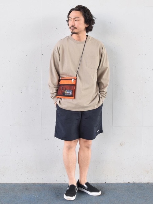 こちらもややゆったりとしたシルエットのナイロンショーツとロングスリーブTシャツのコーデです。「半そでと短パンで組み合わせるのには抵抗がある」という方におすすめの着こなし。トップスにロングスリーブを選ぶことで、不思議と洗練されたコーディネートになります。品の良い無地のTシャツにしているという点も好印象になるでしょう。