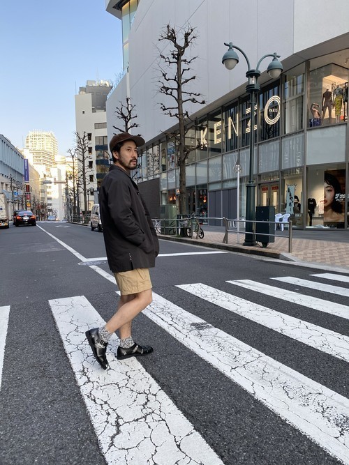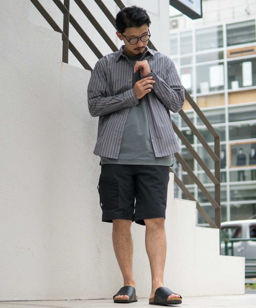 ナイロンショーツの足元にグルカサンダルを組み合わせた、上級者向けコーデです。さらにこちらでは、ジャケットをオンすることでナイロンショーツの可能性を最大限に発揮。カジュアルアイテムながら、レザーシューズやジャケットスタイルにまでコーディネートできる、ナイロンショーツの汎用性の高さがうかがえます。