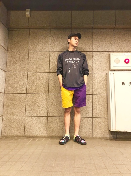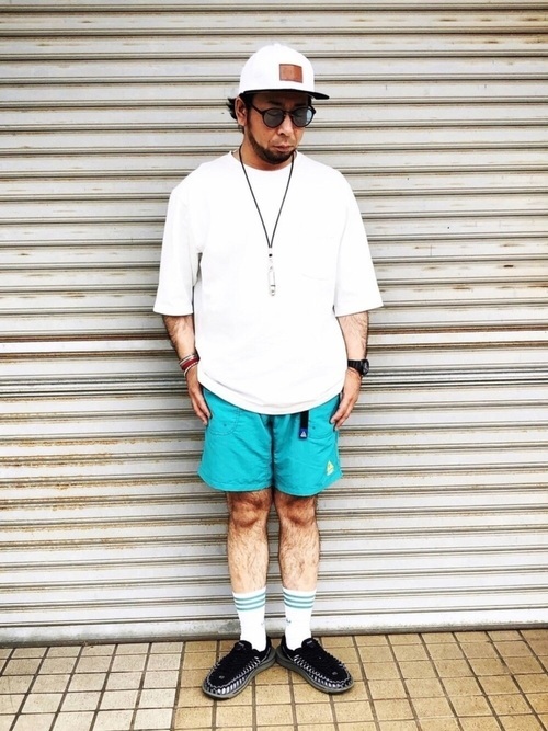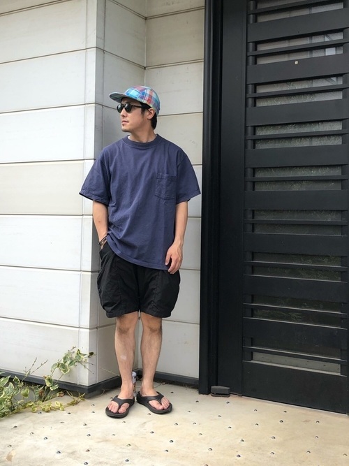 キャップ&サングラスの小物使いが特徴的なナイロンショーツの着こなしです。足元にはトング型のサンダルを組み合わせた、夏ならではのアウトドアスタイル。色をダークトーンにまとめており、アウトドアはもちろんのこと、街着でも活躍するコーデです。