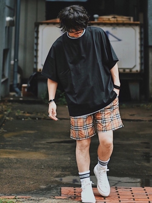 バーバリーチェックが目を引くナイロンショーツ。こちらも先ほどのバイカラーと同様のことが言えますね。洋服のコーデのポイントは「足し算」と「引き算」です。柄や色が派手(足し算)の時は、他にチョイスするアイテムを無地(引き算)にすることで調和させることができるでしょう。