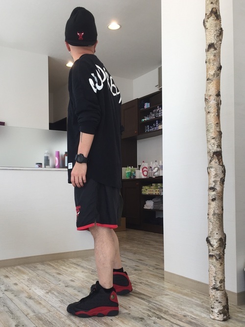 バスケットのハーフパンツタイプのナイロンショーツです。ここでスポーツスタイルをお洒落に見せるポイントをご紹介します。それは「色を拾う」という技です。こちらのコーデでは、帽子・ハーフパンツ・スニーカーにポイントとなる「赤」を入れています。そうすることで着こなしにつながりが生まれ、こなれ感を演出することができるでしょう。