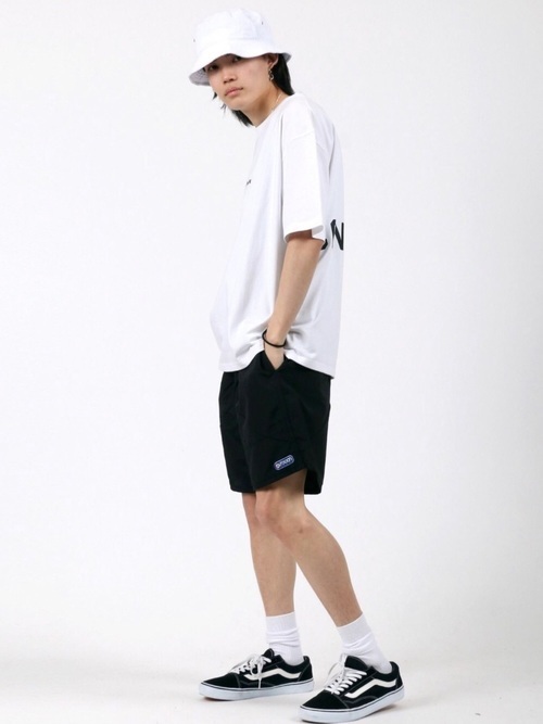 ビックTシャツとナイロンショーツを合わせたストリートスタイルです。膝頭が隠れるほどのナイロンショーツをチョイスし、全体的にゆったりとしたシルエットにしています。ここでのポイントは色を白×黒×グレーのグラデーションにまとめることで都会的な着こなしを演出しています。