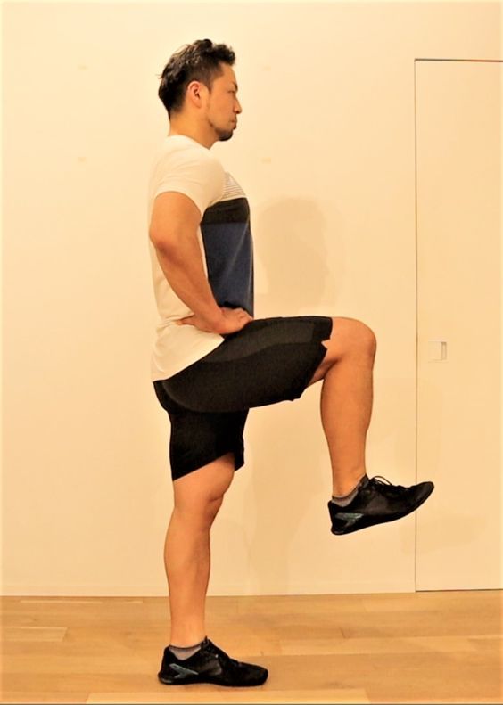 ②視線を下げずに、姿勢を崩さないようにまっすぐ片膝を上げる。