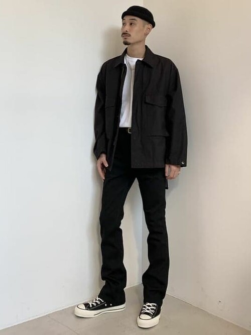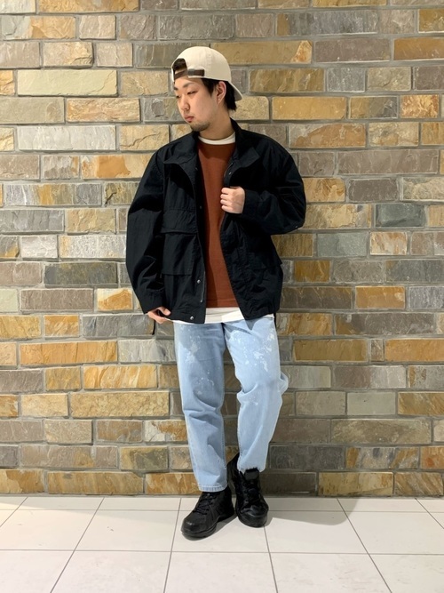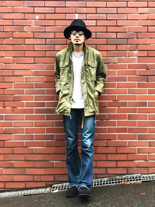 シルエットが細めのM-65にハットをプラスするときれいめな着こなしに。さらにブーツカットデニムを合わせることで、全体がスッキリとした印象にまとまります。