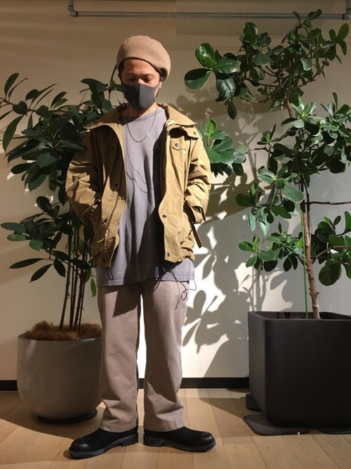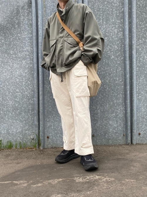 ベージュのM-65を取り入れると落ち着いた雰囲気の着こなしになります。インナーとボトムスの色をそろえ、ベージュのM-65を差し色にしてこなれ感のあるコーデにしてみましょう。