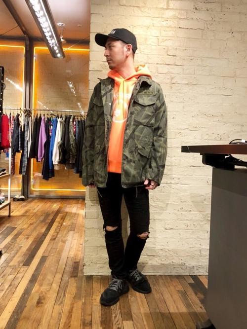 M-65にパーカーを合わせると硬すぎず、ラフでカジュアルなコーデになります。ジーンズなど全体を落ち着いたカラーのメンズアイテムでそろえることで、パーカーでも幼い印象のコーデにはなりません。