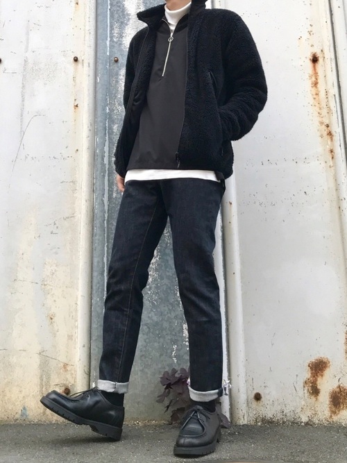 プルオーバーシャツのインナーにタートルネックを重ね着して、季節感を出しています。インナーの白をアクセントにした、黒のワントーンコーデです。ジーンズはロールアップして履くことで、足元をすっきり見せています。