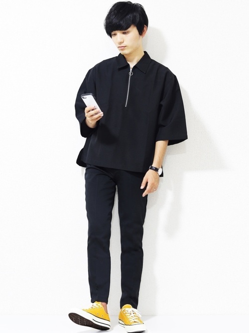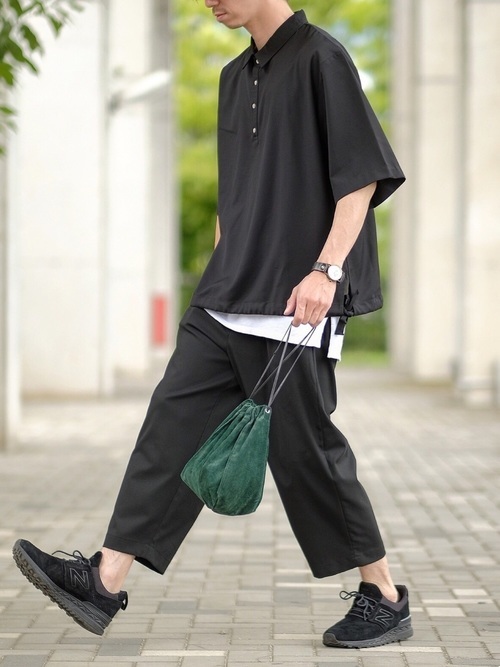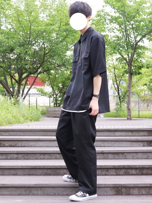 黒のプルオーバーシャツにワイドシルエットのアンクルパンツを組み合わせたメンズコーデです。ワイドパンツは足首を見せることで、すっきりとした印象に。スタイルが良く見えるタックインスタイルもおすすめのコーデです。