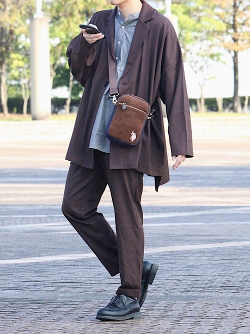 とろみ素材のセットアップのインナーにプルオーバーシャツを組み合わせたメンズコーデです。ブラウンカラーで秋の季節感を出して、全体的にリラックス感のある着こなしとなっています。
