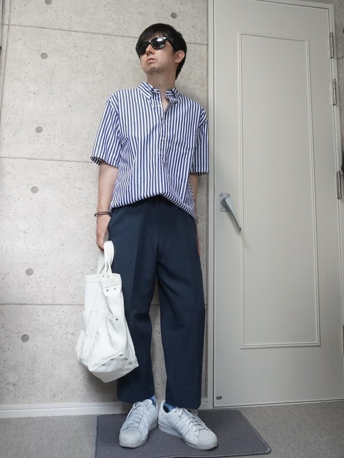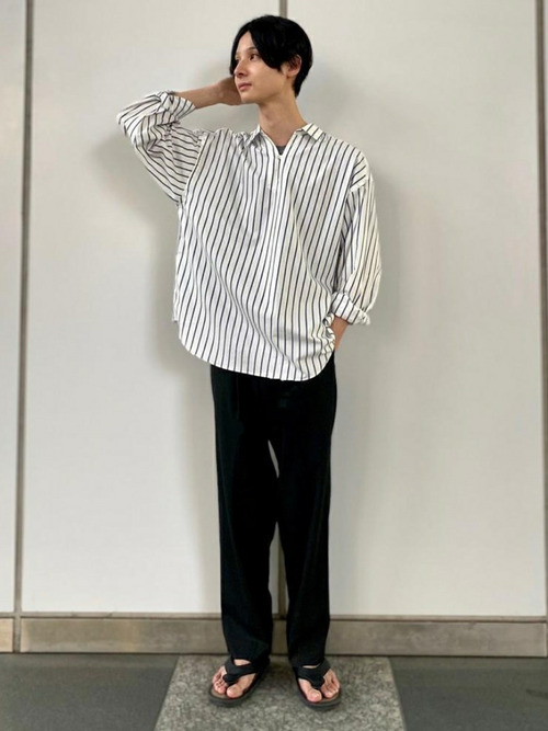 ストライプ柄のプルオーバーシャツにスラックスを合わせたキレイめコーデです。シャツはゆるくタックインすることで、ラフ感は残しつつもスタイルが良く見える着こなしに仕上げています。