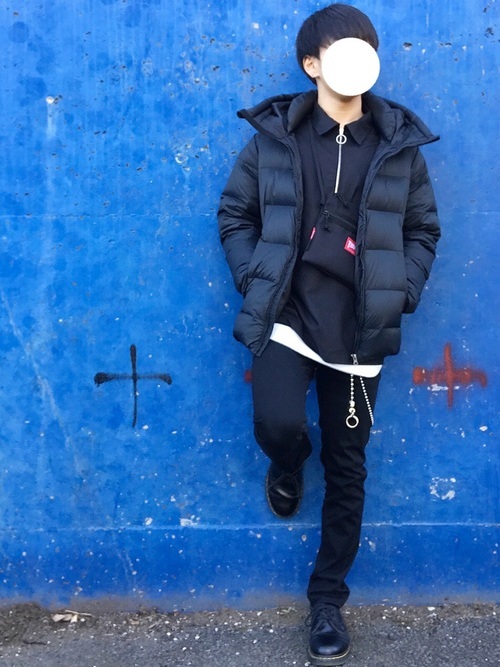 黒のプルオーバーシャツとジーンズ、ドレスシューズを合わせて、落ち着いたキレイめコーデに仕上げています。羽織りアイテムにダウンジャケットをセレクトすることで、程よくカジュアルな印象に。