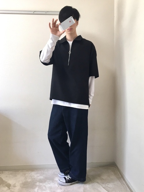 5分袖プルオーバーシャツのインナーに長袖Tシャツを着用したメンズコーデです。ジーンズはトレンドのワイドシルエットをセレクト。足元のスニーカーはシャツとカラーを合わせて、ゆったりとまとまりのある着こなしに仕上げています。
