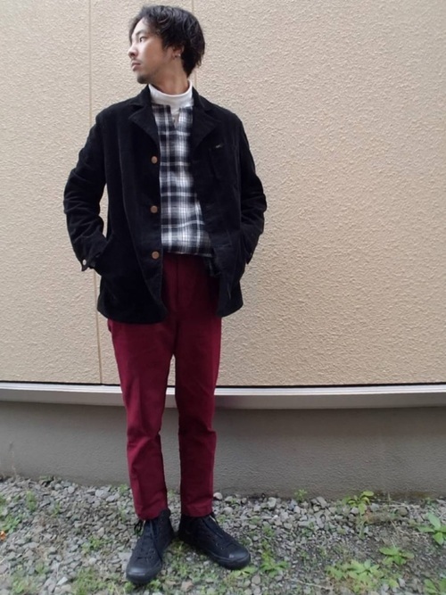 チェック柄のプルオーバーシャツとトータルネックTシャツを重ね着したメンズコーデです。ワインレッドカラーのパンツを合わせて、柄と色の両方で季節感を出しています。