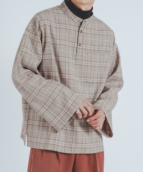 ベージュとネイビーはチェック柄、ライトブルーはストライプ柄となっていて、季節感を取り入れるのにおすすめのプルオーバーシャツです。襟がバンドカラーの作りなので、カジュアルなコーデにぴったりのアイテム。