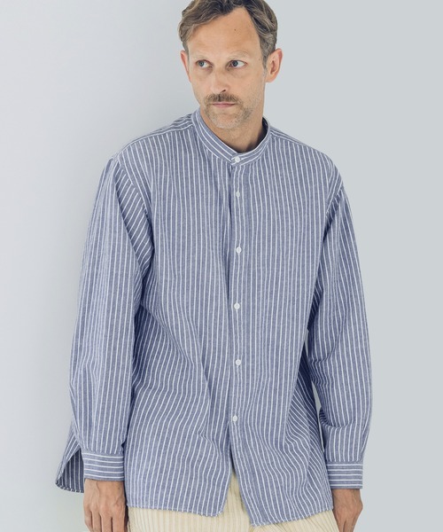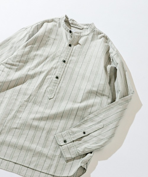 程よくゆったりとしたシルエットと、着古したような風合いが特長のプルオーバーシャツ。生地は起毛ストライプのコットンフランネルを使用して作られています。柄は、ネイビーストライプとホワイトストライプの2種類の柄シャツがラインナップ。