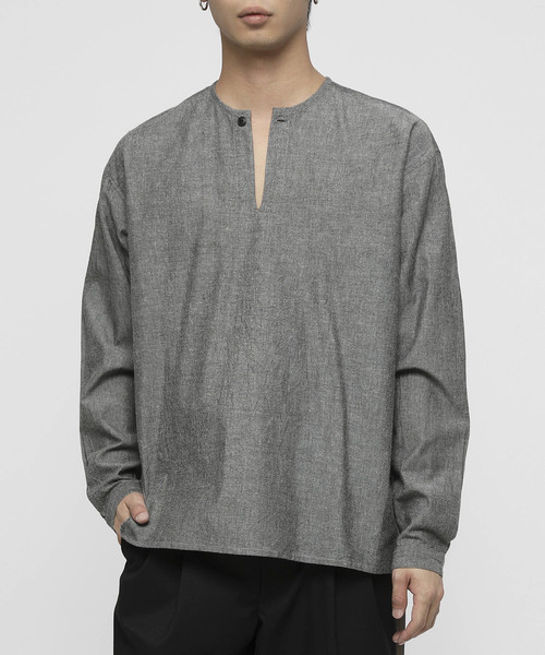 ノーカラーでゆったりとしたシルエットのプルオーバーシャツは、大人の上品なリラックス感を演出してくれます。1枚で着用するのはもちろん、Tシャツの上にさらっと着るのもおすすめ。シンプルな着こなしがハマるアイテムです。