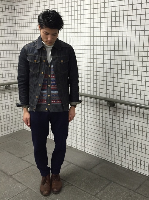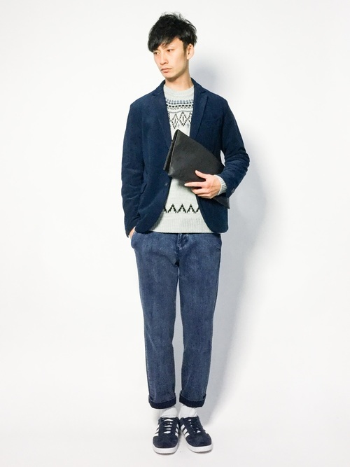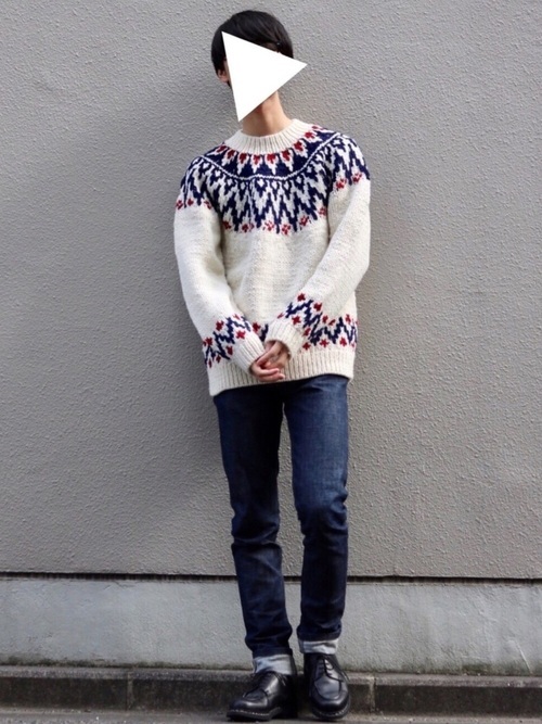 オーソドックスなノルディックセーターのコーデです。白地のセーターがとても爽やかでブルーの柄がブルーデニムとの統一感が生まれて柄物でもスッキリしています。
