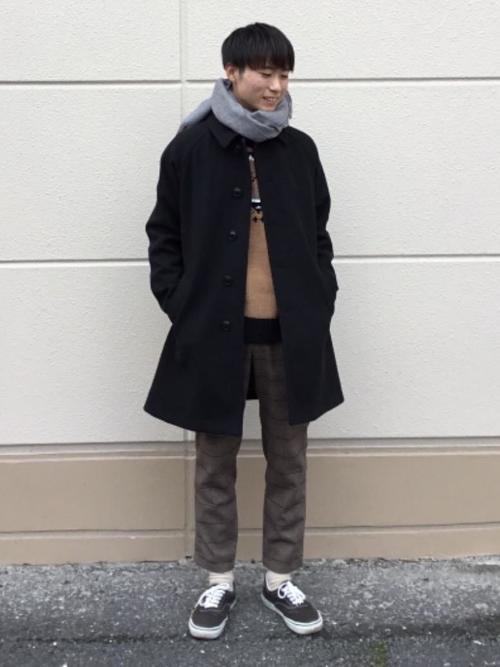 黒のステンカラーコートからチラッと見えるノルディックセーターがコーディネートを上品に仕上げています。優しいベージュ色のセーターで柔らかい冬コーデです。