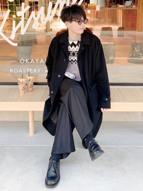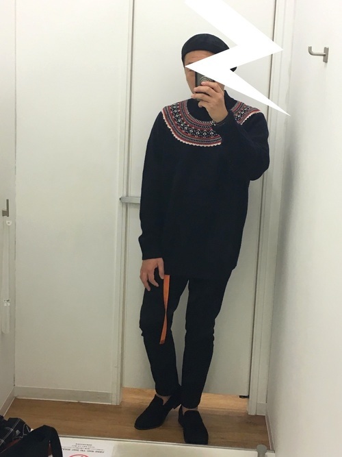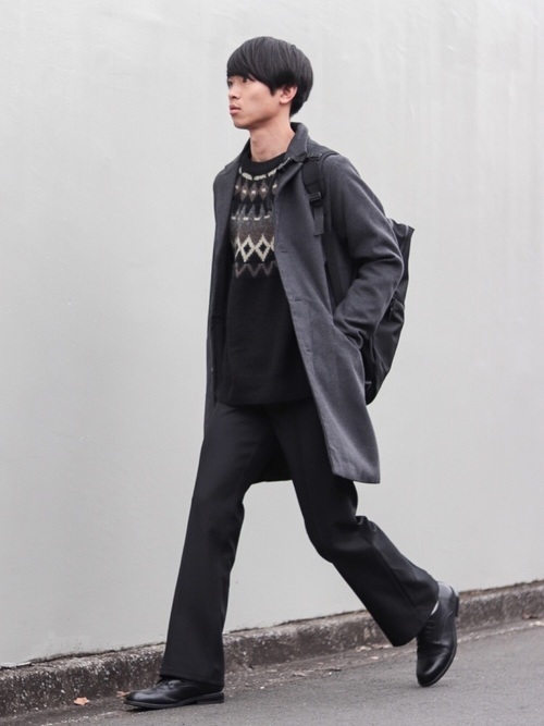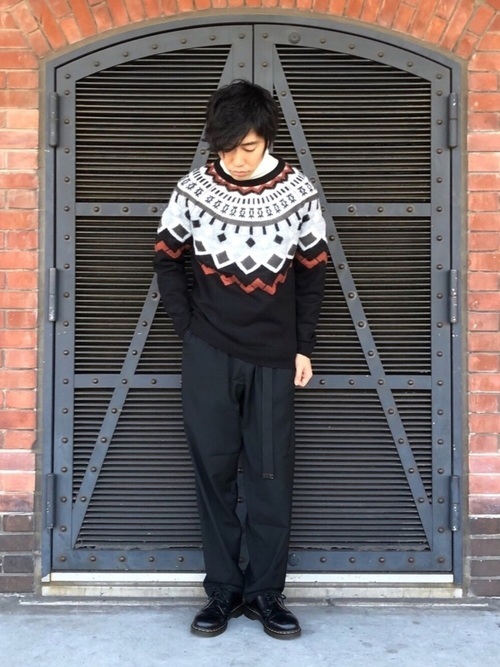 ブラックでまとめたノルディックセーターのクールなコーディネートになっています。襟元だけに柄のあるノルディックセーターを選んだことで小顔効果、さらに上にポイントが行くのでスタイルもよく見えますね。