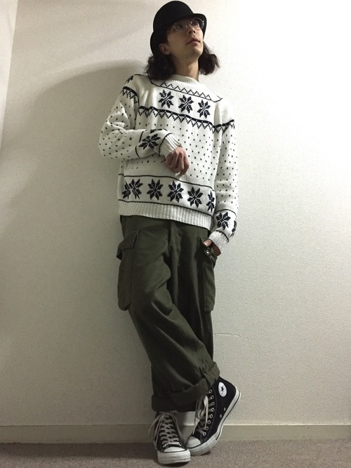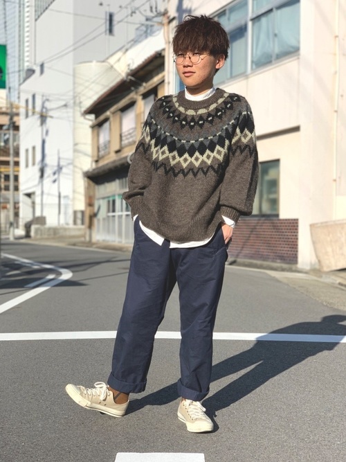 ゆったりとしたカーゴパンツに柔らかいノルディックセーターを合わせた気取らないカジュアルコーデ。色味を抑えてノルディック柄をスッキリ着こなしていますね。