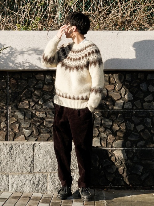 デニムやチノパンと合わせることが多いノルディックセータ/ニットですが、コーデュロイパンツと合わせても冬らしい着こなしです。コーデュロイの温もりのある質感との相性がよく、寒い冬にぴったりのコーディネイト。コーデュロイパンツはデザインやシルエットがスッキリしたものを選ぶのがポイント。選択を間違えると野暮ったく見えてしまうので要注意です。