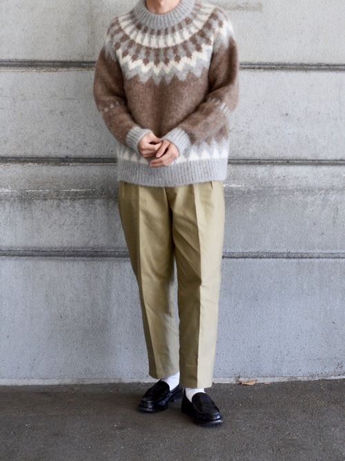 国内の老舗ニットメーカーのブランドらしい上質なモヘアとファンシーヤーンを高度な技術で編み上げています。上品なノルディック柄と仕上げにミンク加工が施されているのでチクチク感がない柔らかい肌触り。程良いゆったり感が着やすいトラディショナルなセーターです。