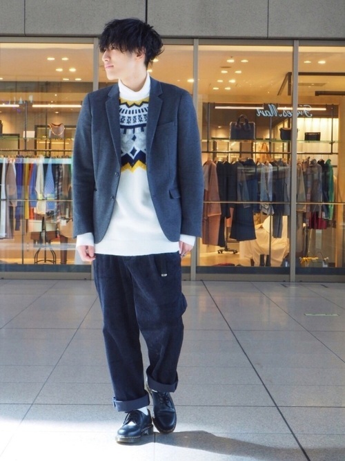 ノルディック柄のニットベストにニットジャケットというニットONニット。難しい組み合わせをオレンジのシャツとチラッと見せたノルディック柄のソックスでおしゃれにコーディネートしています。