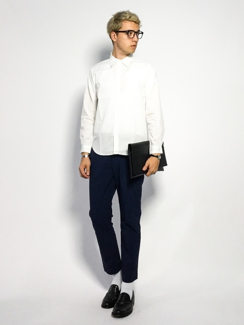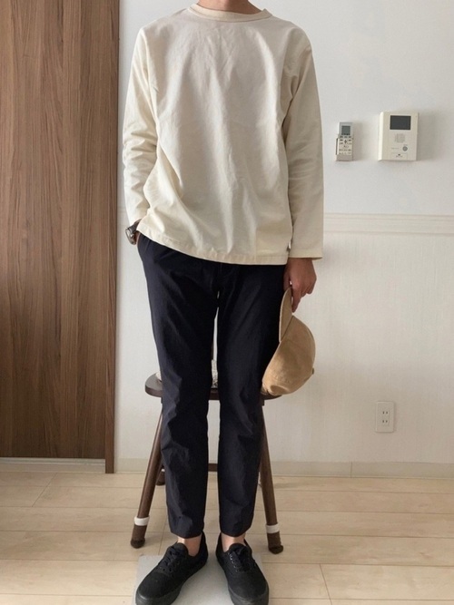 白のカットソーにナイロンパンツを合わせ、靴はスニーカーというシンプルな着こなしのメンズコーデです。普遍的なコーデですが、アンクル丈のナイロンパンツでこなれ感を演出したり、パンツと靴のカラーを合わせて脚長効果があったりとおしゃれさを垣間見ることができます。