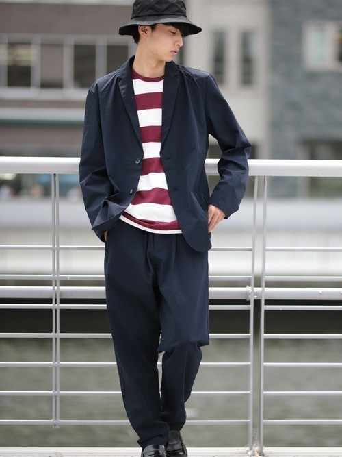 テーパード型のナイロンパンツを使ったモノトーンカラーのセットアップコーデ。靴や帽子の小物までネイビーに統一されていて洗練されたイメージです。インナーは目を引く赤と白のボーダーで、差し色が絶妙に良いバランスで組み合わされている上級者の着こなしです。