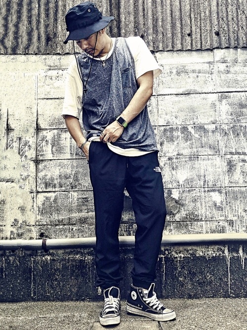 こちらは、ナイロンパンツにハイカットのスニーカー靴を合わせた古着コーデです。スポーツウェアのナイロンパンツはスニーカー靴と合わせると、スポーティーになりすぎることがあります。そこで、ハイカットのスニーカー靴をセレクトすることで、スポーツ感を抑え、タウンユースが可能なメンズコーデになります。