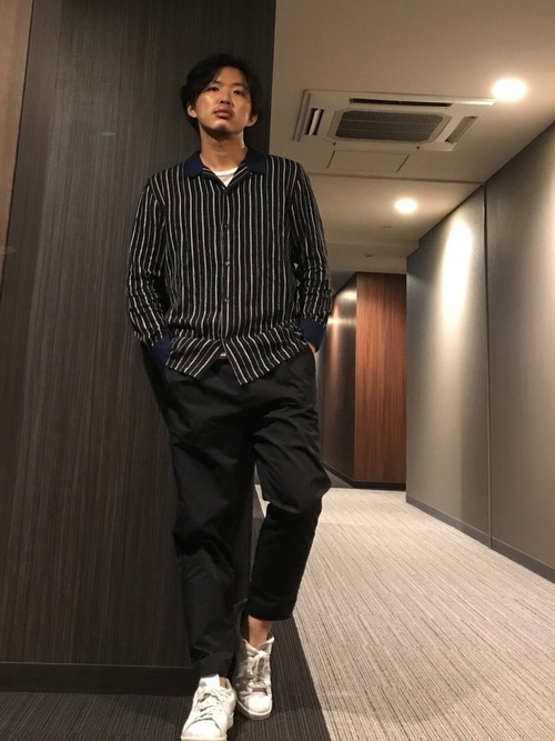 ストライプのオープンカラーシャツとナイロンパンツをあわせたカジュアルなメンズコーデです。トップスとパンツをダークカラーベースに統一することで、白のスニーカー靴がとても良いアクセントになっています。足首が見えるテーパード型ナイロンパンツは脚長効果があり、スタイルを良く見せたい方におすすめです。