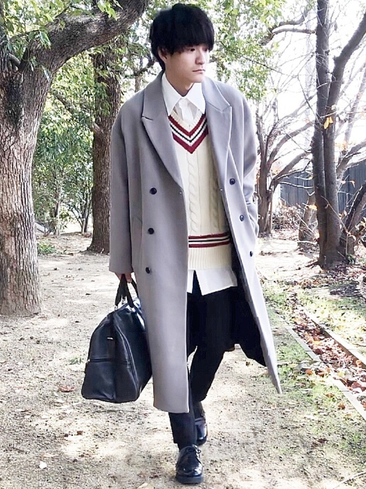 ライトグレーのロングコートには、白のチルデンニットとシャツを合わせれば清潔感のあるメンズコーデに。シャツはレイヤードさせて、旬な着こなしにアップデート。赤のラインデザインがモノトーンコーデの差し色になっています。