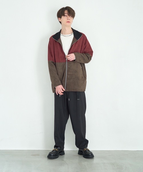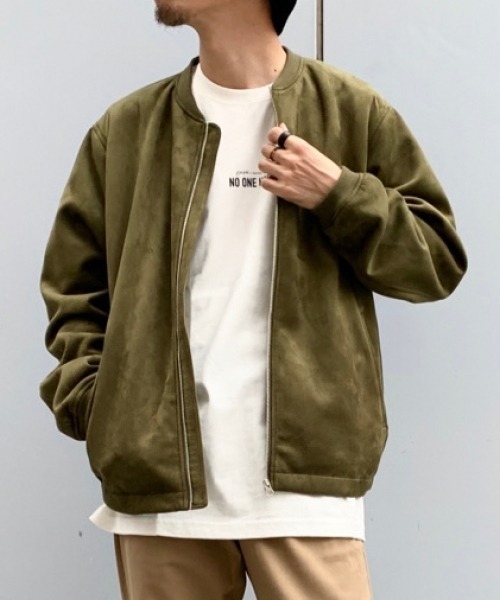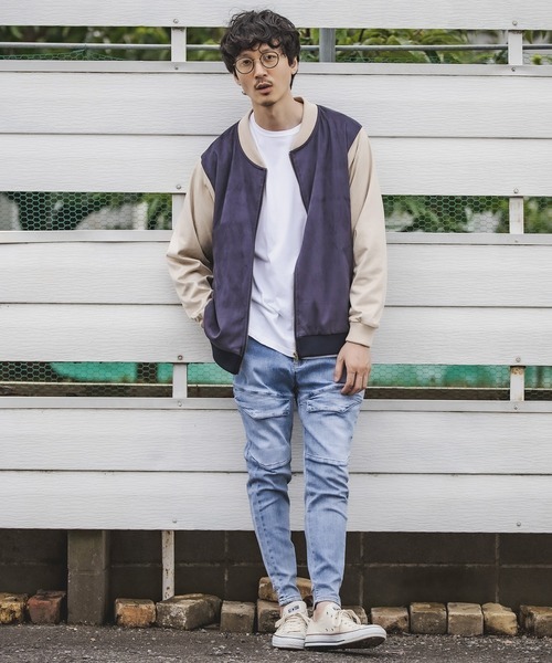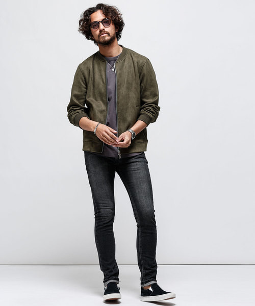 ミリタリーテイストなメンズのボンバージャケットも、スエード素材ならいつもと違う雰囲気が楽しめますね。袖の配色切り替えがアクセントになっており、シンプルなパンツを合わせるだけで様になります。