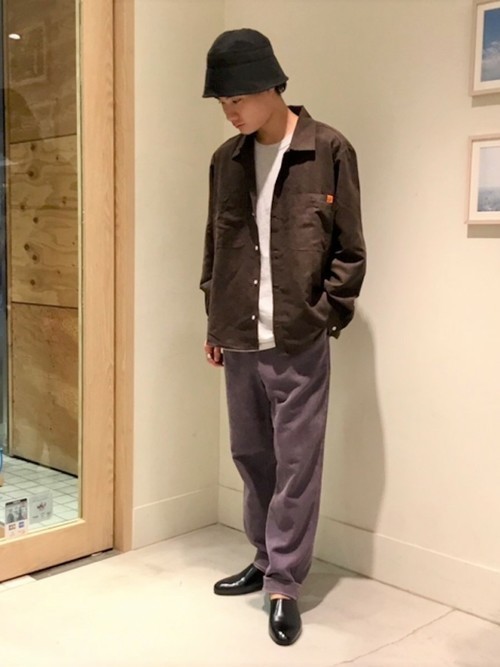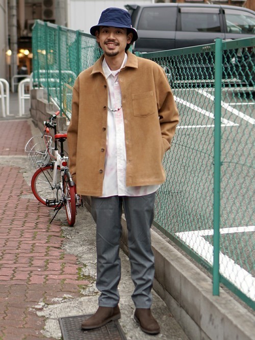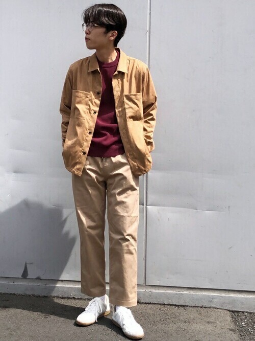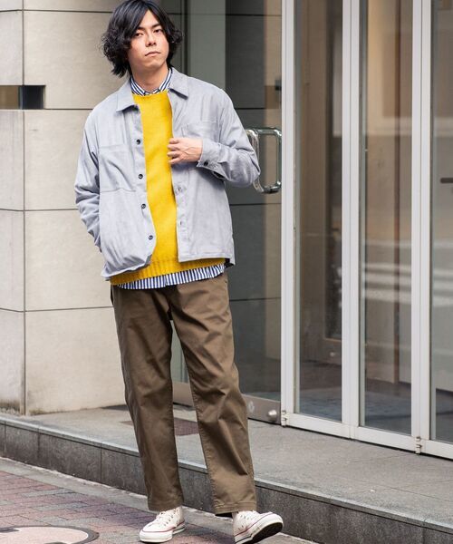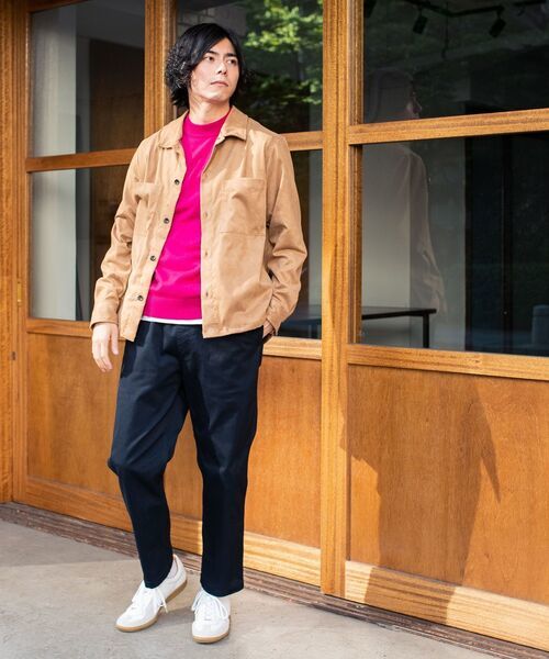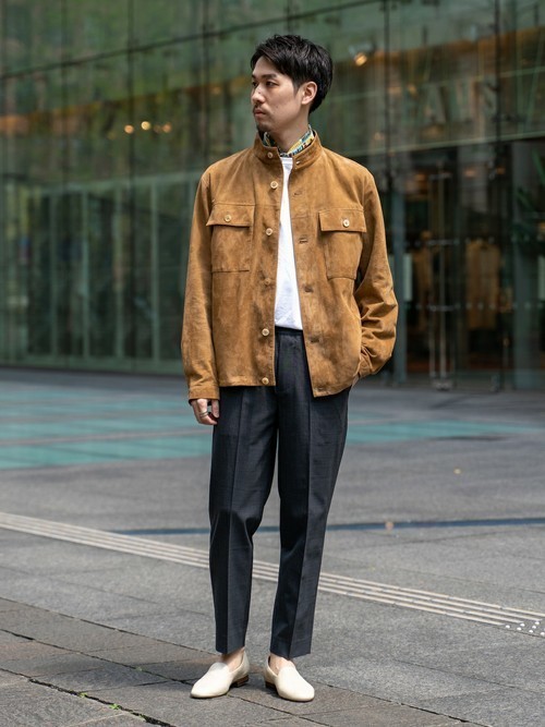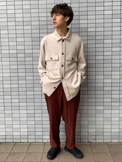 スエード素材のCPOシャツジャケットは、トレンドムードたっぷりですね。ブラウンのパンツを合わせることで、季節感がでます。
