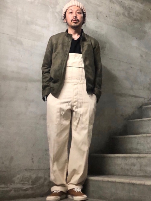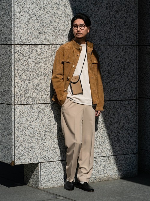 キャメルのスエードジャケットに、オフホワイトの古着のパンツを合わせたヴィンテージ感のあるおしゃれなメンズコーデです。ワイドパンツをゆるっと着ることで、こなれた雰囲気に仕上がります。