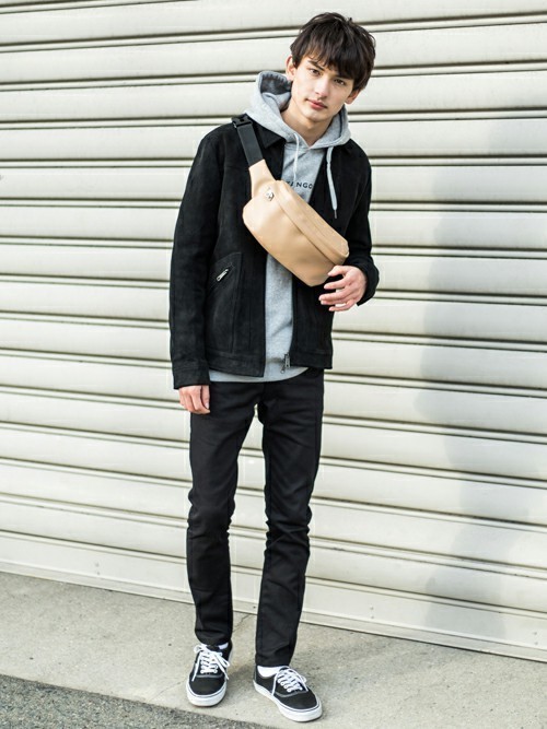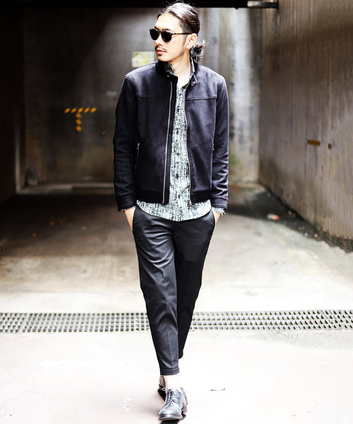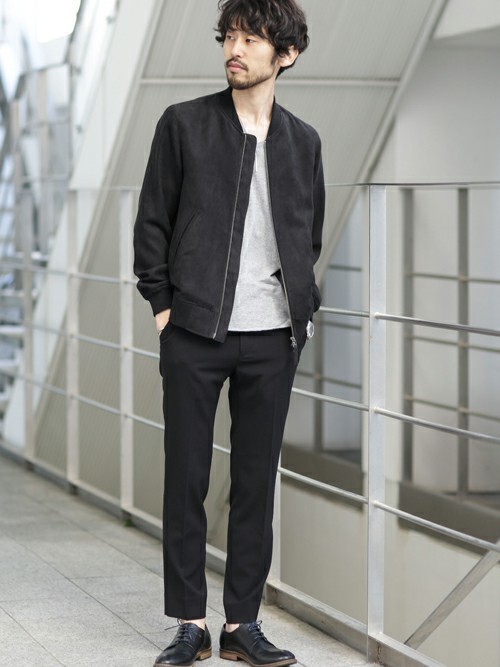 スエードジャケットとパンツを黒でまとめたメンズコーデです。ジャケットとボトムを同じカラーにすることで、スエード素材の上品な光沢感が引き立ちます。