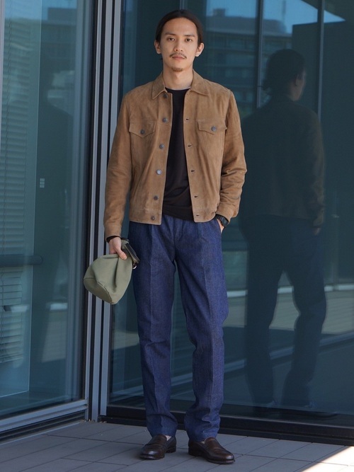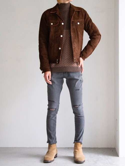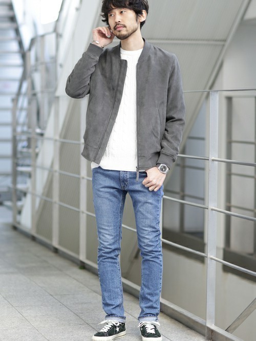 スエードジャケット×デニムパンツの淡色メンズコーデ