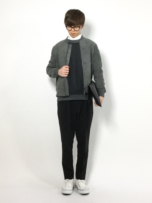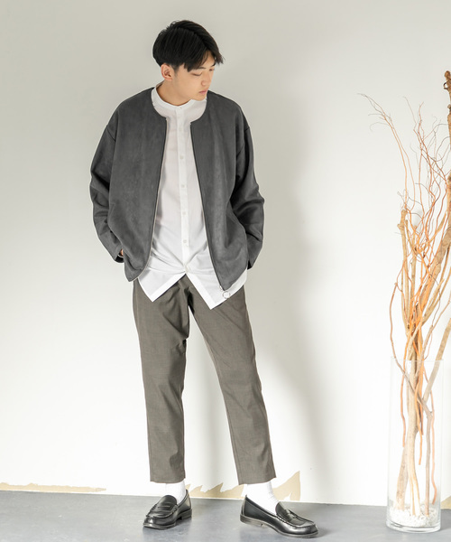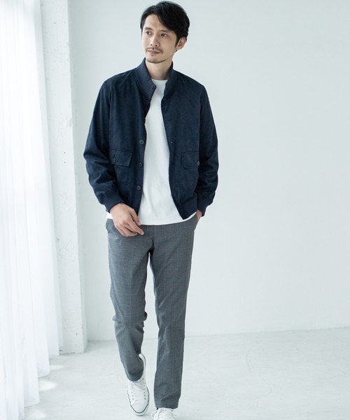きれいめコーデが好きな人は、スエードジャケットにテーパードパンツを合わせるのがおすすめです。センタープレス入りのパンツが脚のラインをきれいに見せてくれますよ。足元は白のドレスシューズで、軽やかな彩りをプラスしましょう。