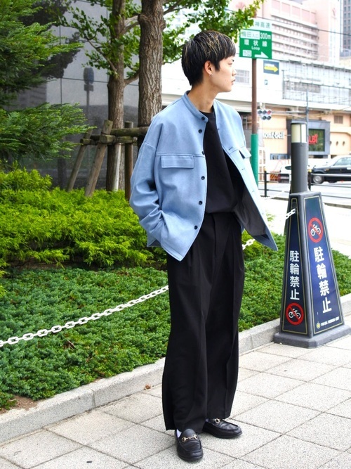 ブルーの爽やかなスエードジャケットは、春コーデにもぴったりのアイテムです。インナーやワイルドパンツを黒でまとめて、モードな雰囲気を楽しみましょう。