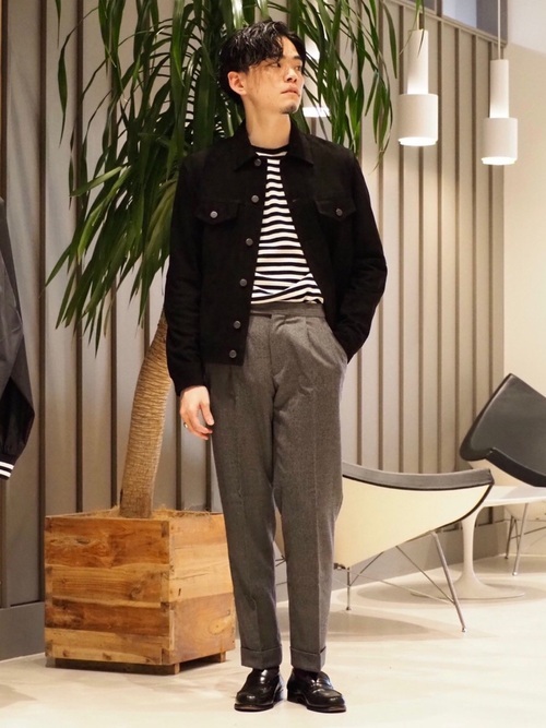 スエードジャケットにボーダートップスを合わせてカジュアルダウンするのが今っぽいですね。パンツはきれいめを選ぶと、垢抜けた雰囲気にまとまります。