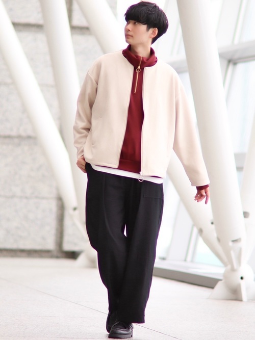 黒やネイビーなどダークカラーのアウターを既に持っている場合は、白のスエードジャケットにチャレンジしてみませんか。赤のリングジップスウェットで差し色することで、一気に冬らしい装いが完成します。