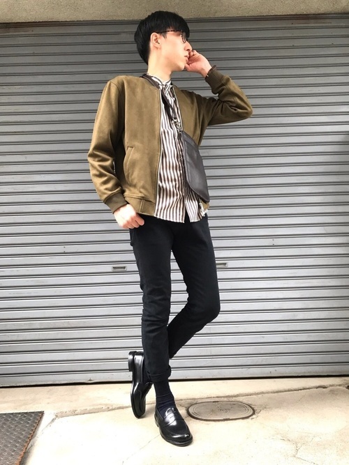 男臭くなりがちなカーキのスエードジャケットですが、ストライプシャツをインナーに選ぶことでシックで上品な着こなしに。パンツの裾はいつもより多めにロールアップすると、おしゃれ度がアップしますよ。