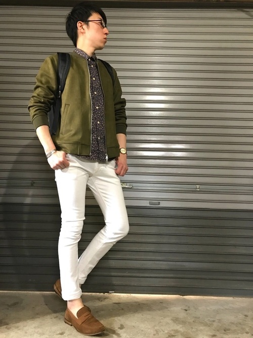 カーキのスエードジャケットに、春らしい花柄のシャツを合わせることで、シーズンライクな着こなしが叶います。ジャケットにリンクさせてシューズもスエード素材を選ぶと、全体の統一感がアップしますよ。