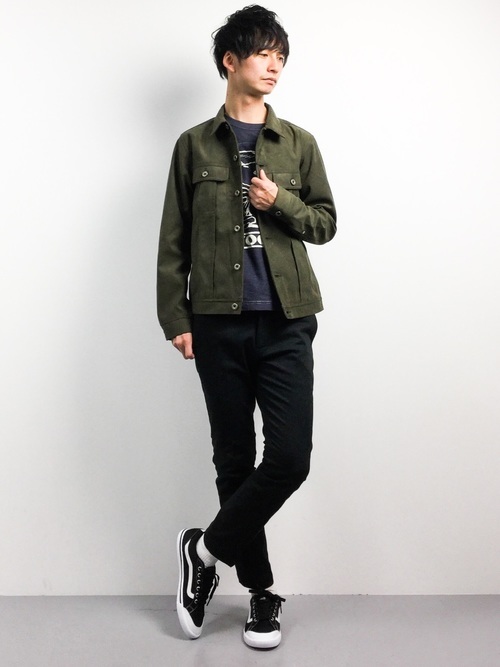 カーキのスエードジャケットに黒のコンパクトなパンツを合わせたメンズコーデです。少し重たく見えてしまうカラーなので、白の靴下をパンツの裾からチラ見せして、足元を軽やかに仕上げましょう。
